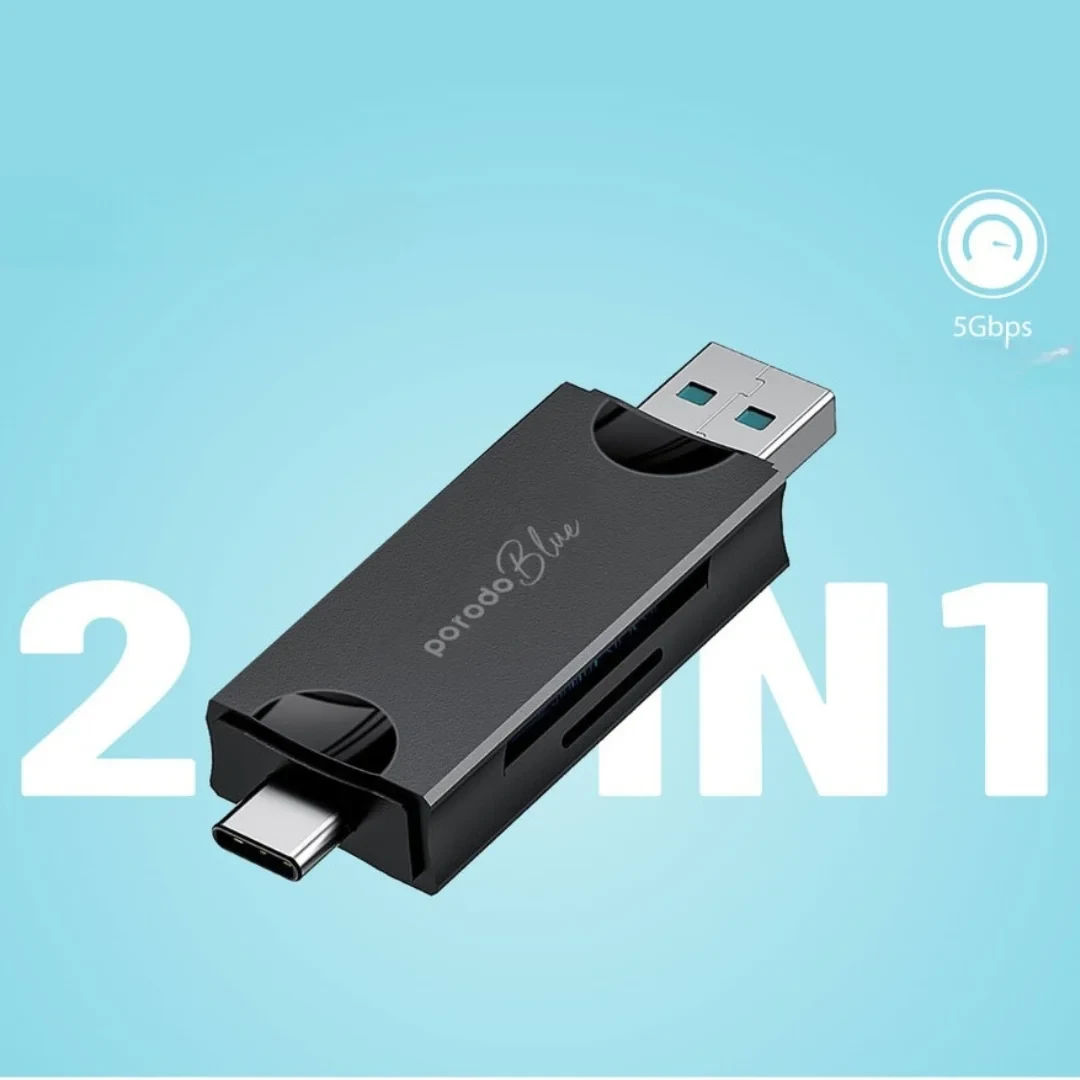 کارت‌خوان Porodo Blue 2-in-1 دارای دو رابط Type-C و USB 3.0 است که امکان انتقال با سرعت تا 5 Gbps را فراهم می‌کند. این ویژگی آن را برای انتقال سریع عکس‌ها و ویدیوهای حجیم مانند فایل‌های دوربین یا پهپاد مناسب می‌سازد.